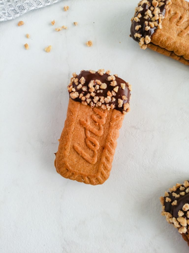 Dip half or 1/3 of each sandwich into melted chocolate. Sprinkle with chopped hazelnuts or crushed Lotus crumbs.